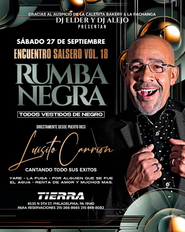 ¡Atención Sábado 27 de Septiembre! Todos los salseros en Filadelfia a marcar sus calendarios para el Encuentro Salsero Vol. 18, la Rumba Negra con Luisito Carrión directamente desde Puerto Rico cantando todos sus éxitos en Tierra Philly. +21 para entrar. Para reservaciones y mayor información: 215-2668665 | 215-869-8082