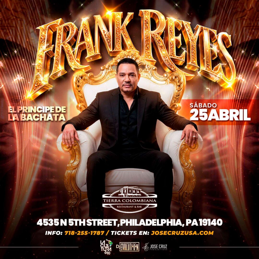 Sábado 25 de abril llega a Tierra Colombiana el Príncipe de la Bachata, Frank Reyes, cantando todo su repertorio musical, un evento que no te lo puedes perder.